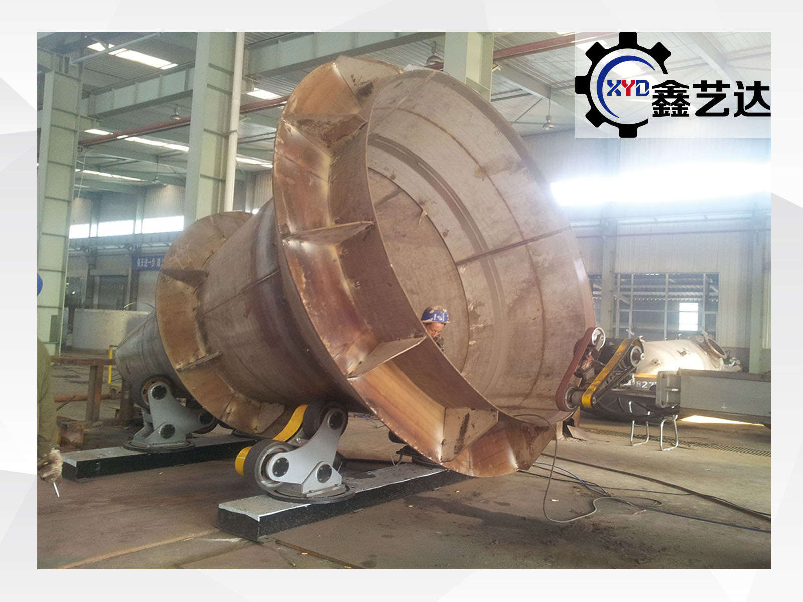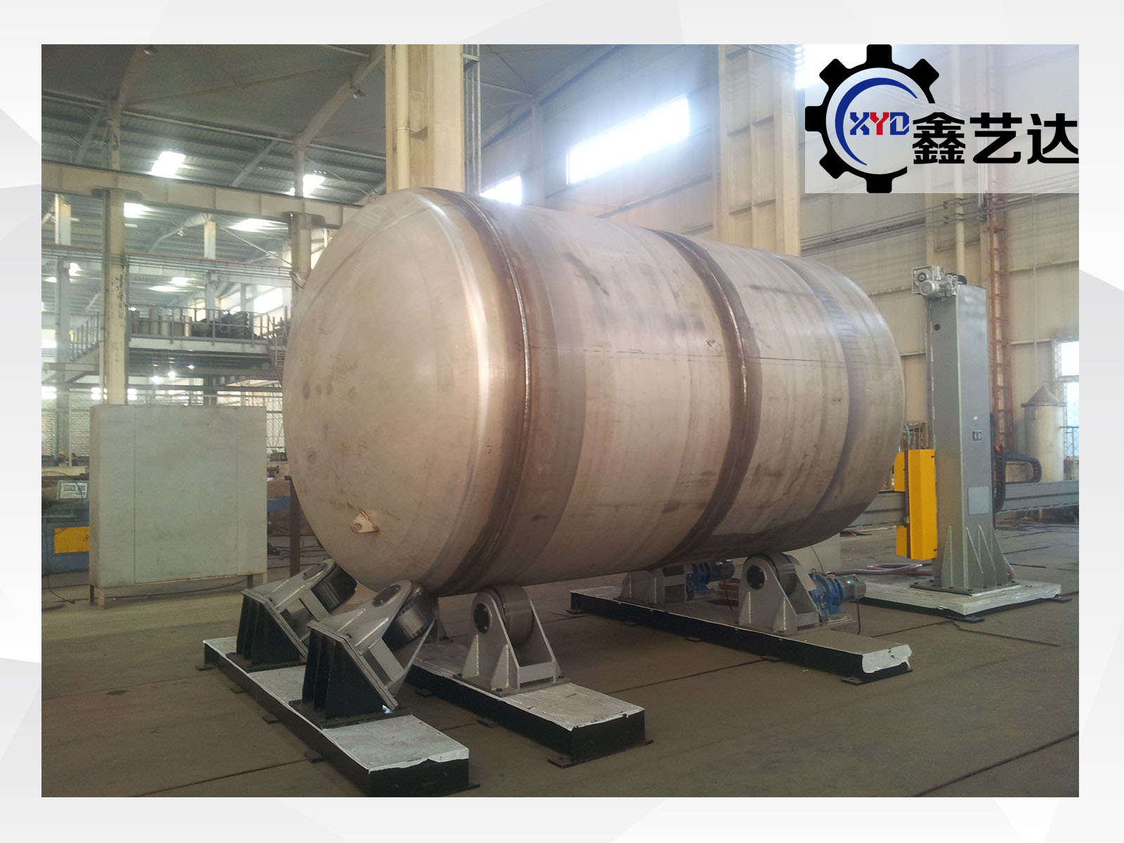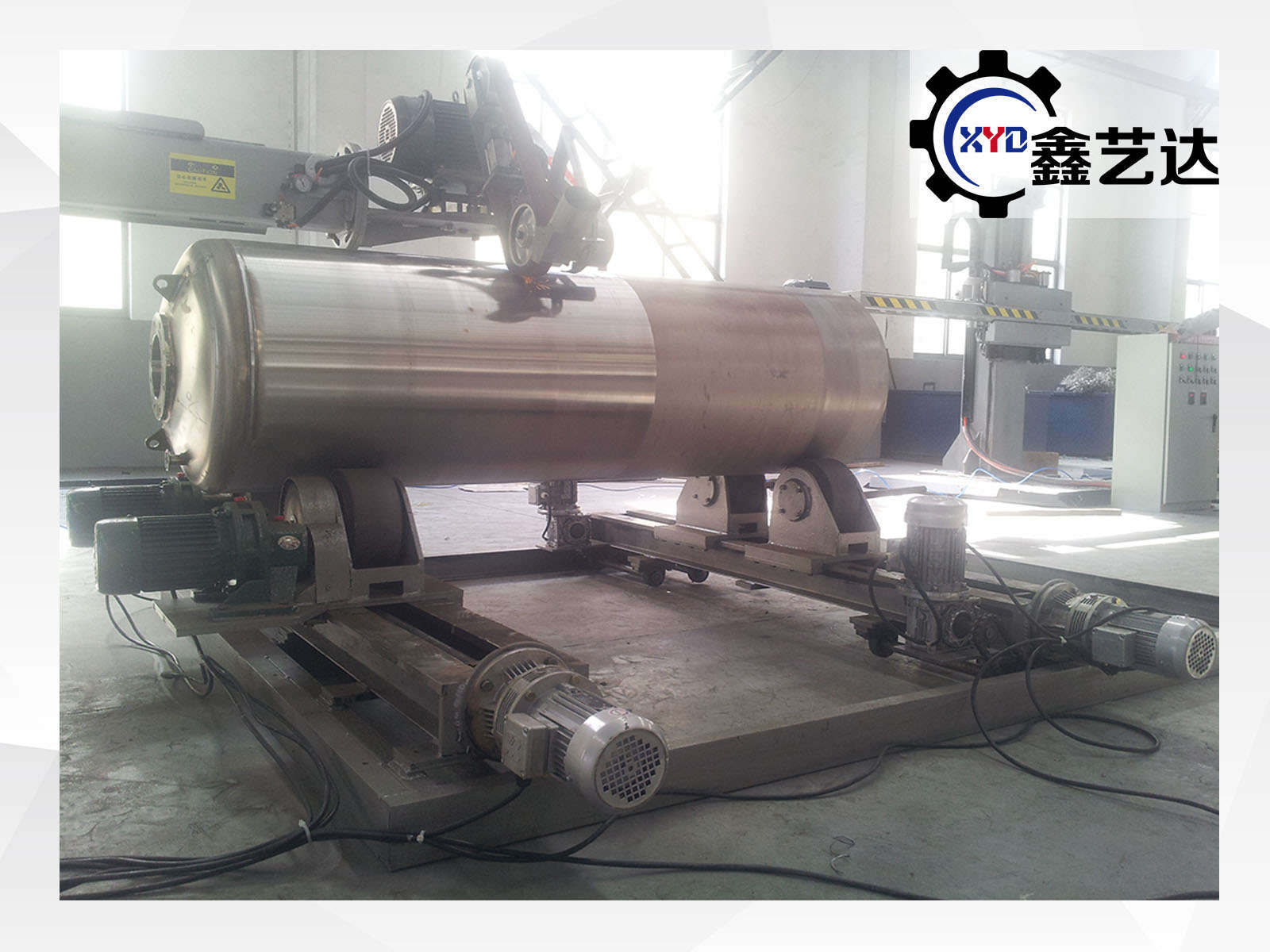 罐體轉(zhuǎn)臺,載重2-10噸,φ500-φ4500 mm范圍可調(diào),采用齒輪減速機電機驅(qū)動,帶動罐體臥式旋轉(zhuǎn),速度變頻可調(diào)。